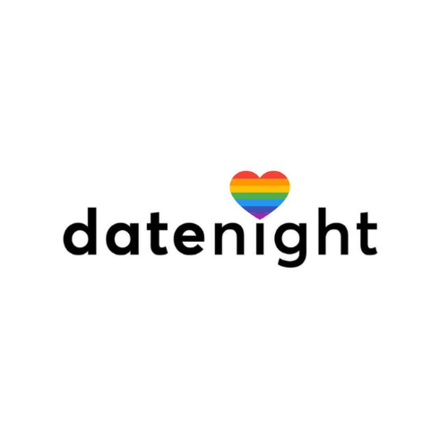 Two people smiling and clinking champagne glasses, with one kissing the other on the cheek in front of a neon sign.