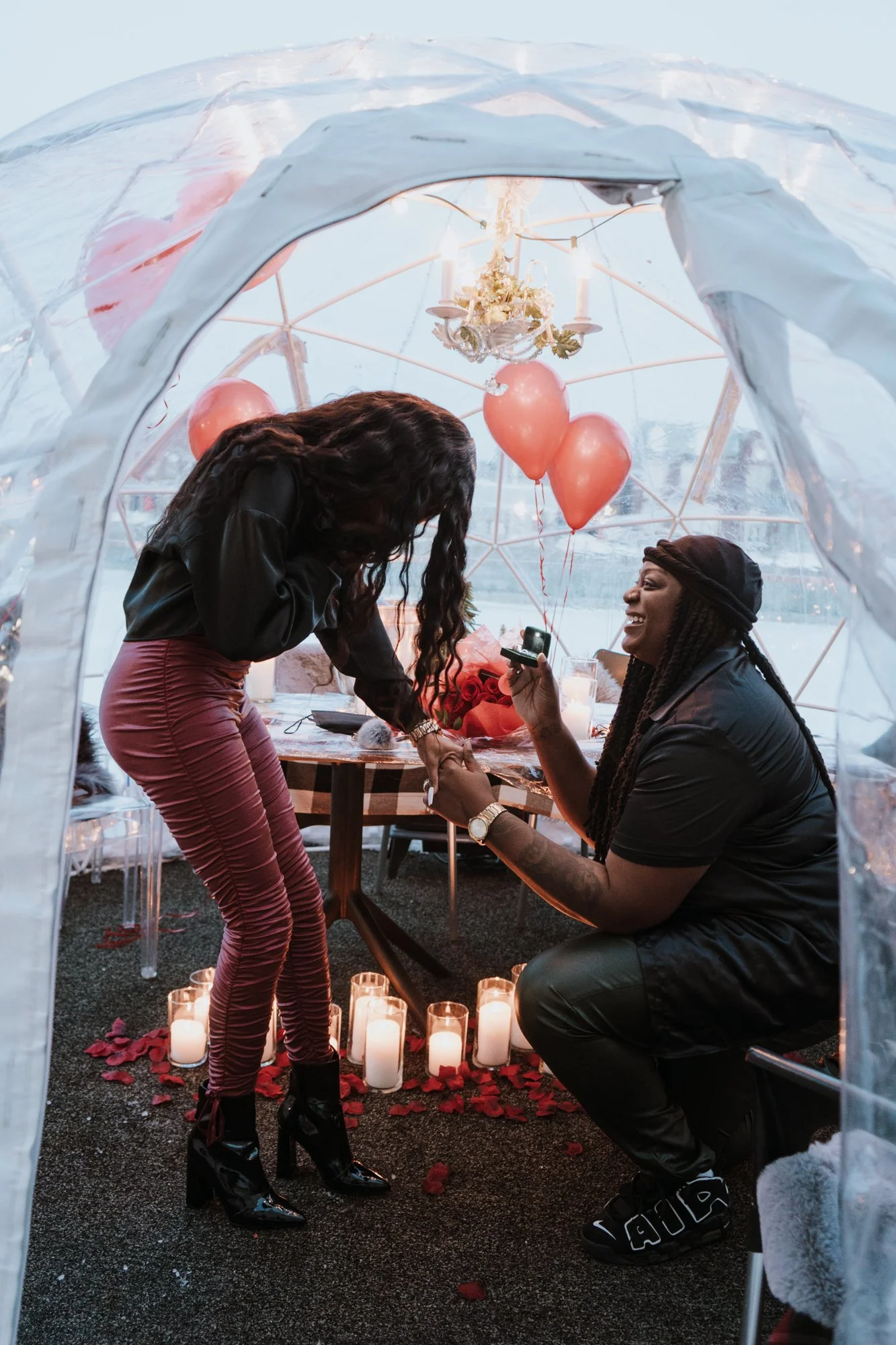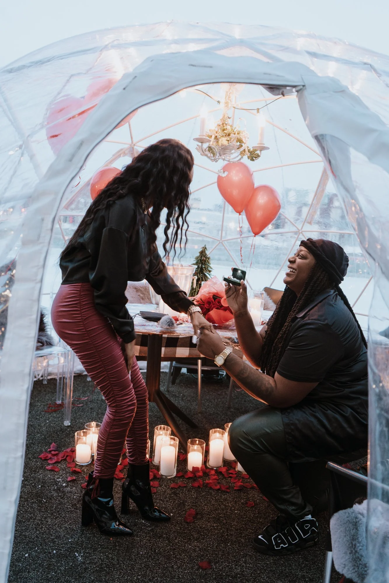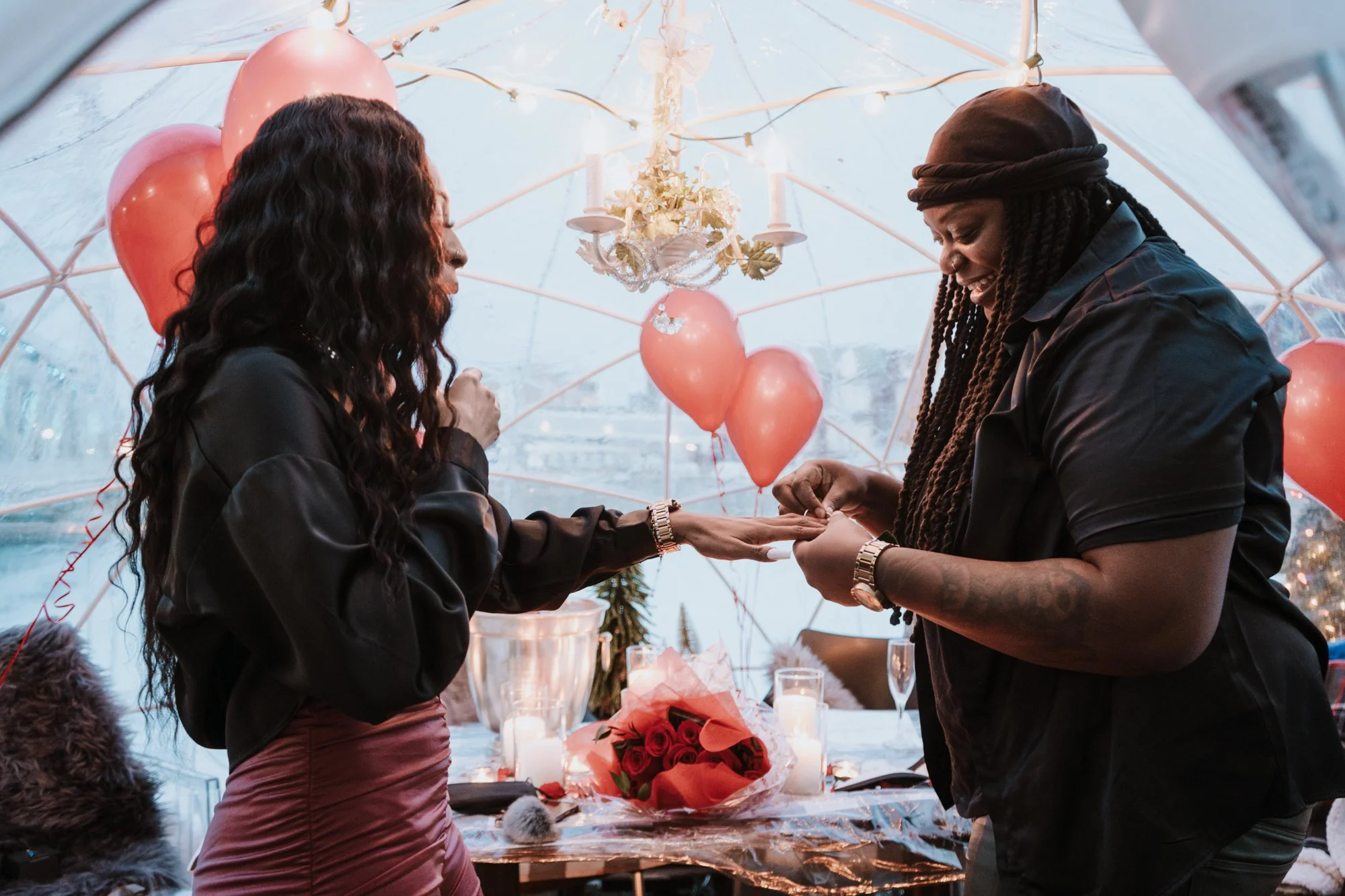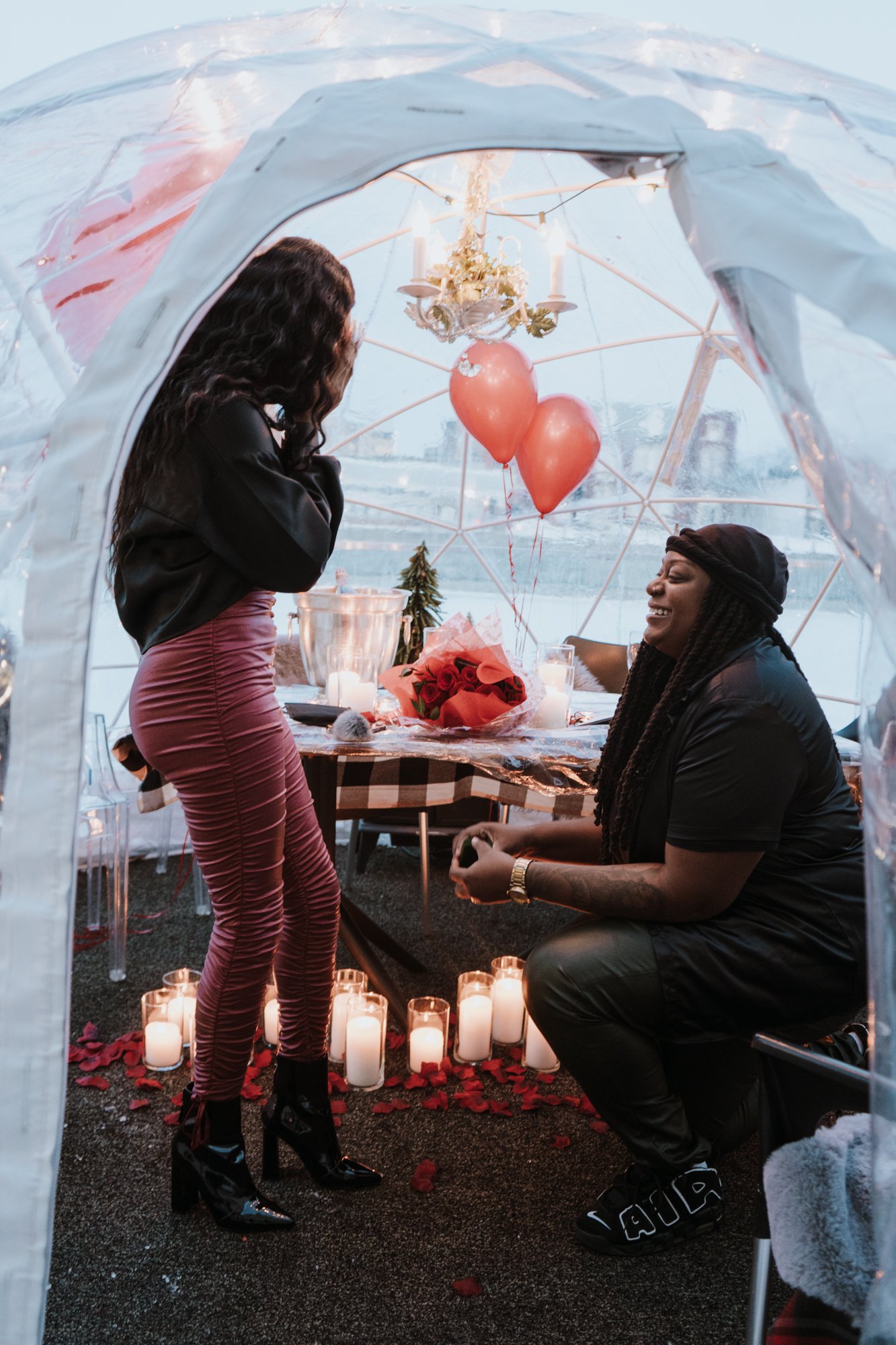 Dee & Shays stunning winter igloo proposal in the beautiful Niagara region. Tucked away in a stunning atmosphere amongst a restaurant by the water, this winter wedding proposal was to die for. Dee & Shay assumed a regular dinner date was in the works when they were whisked away into a private igloo amongst the snow and lights, to Shay’s surprise it was filled with roses, champagne, candles and balloons ready for Dee to get on one knee. A once in a lifetime moment no one will ever forget…