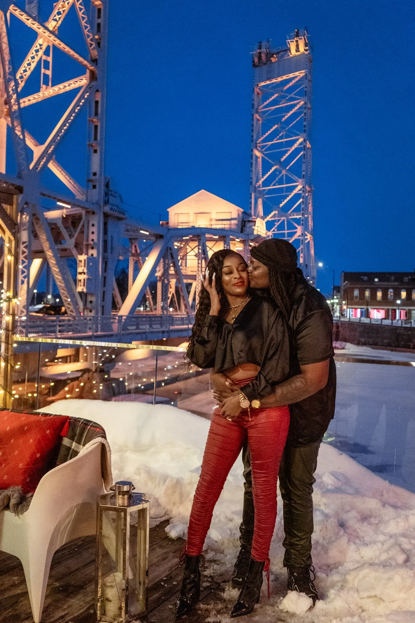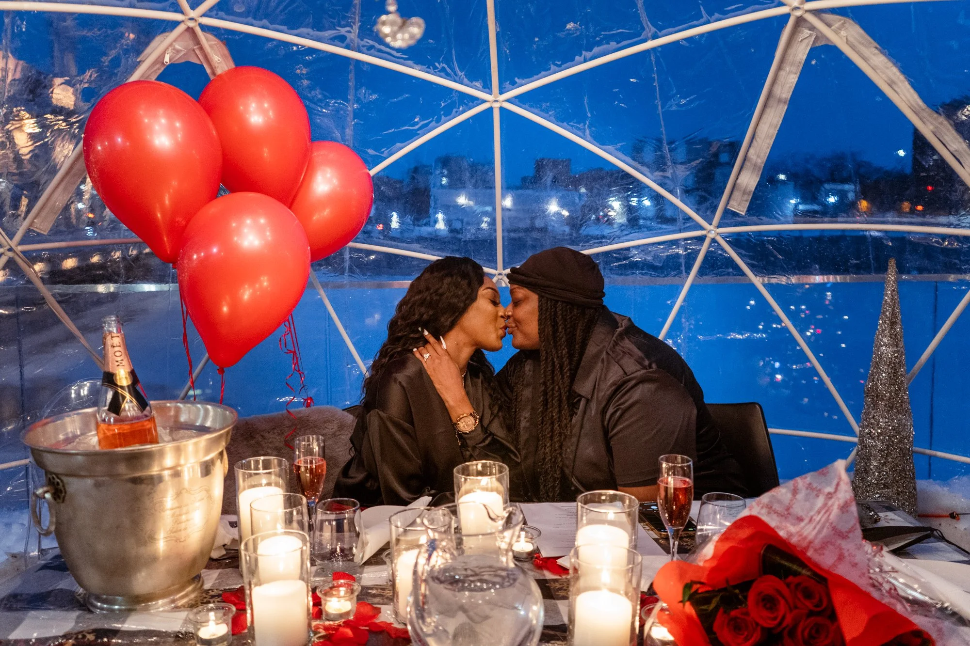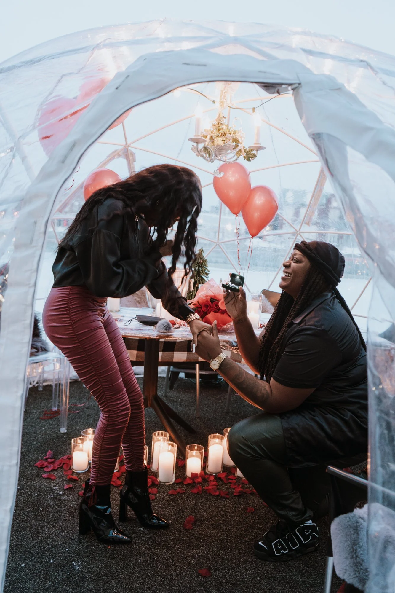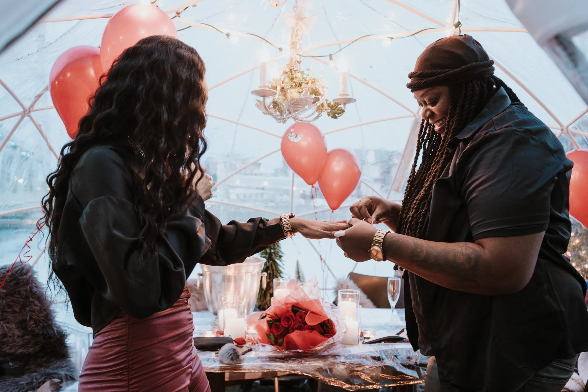 Dee & Shays stunning winter igloo proposal in the beautiful Niagara region. Tucked away in a stunning atmosphere amongst a restaurant by the water, this winter wedding proposal was to die for. Dee & Shay assumed a regular dinner date was in the works when they were whisked away into a private igloo amongst the snow and lights, to Shay’s surprise it was filled with roses, champagne, candles and balloons ready for Dee to get on one knee. A once in a lifetime moment no one will ever forget…