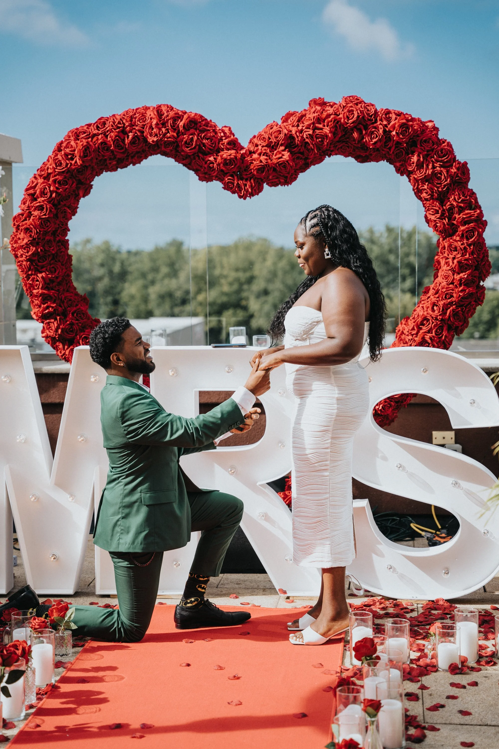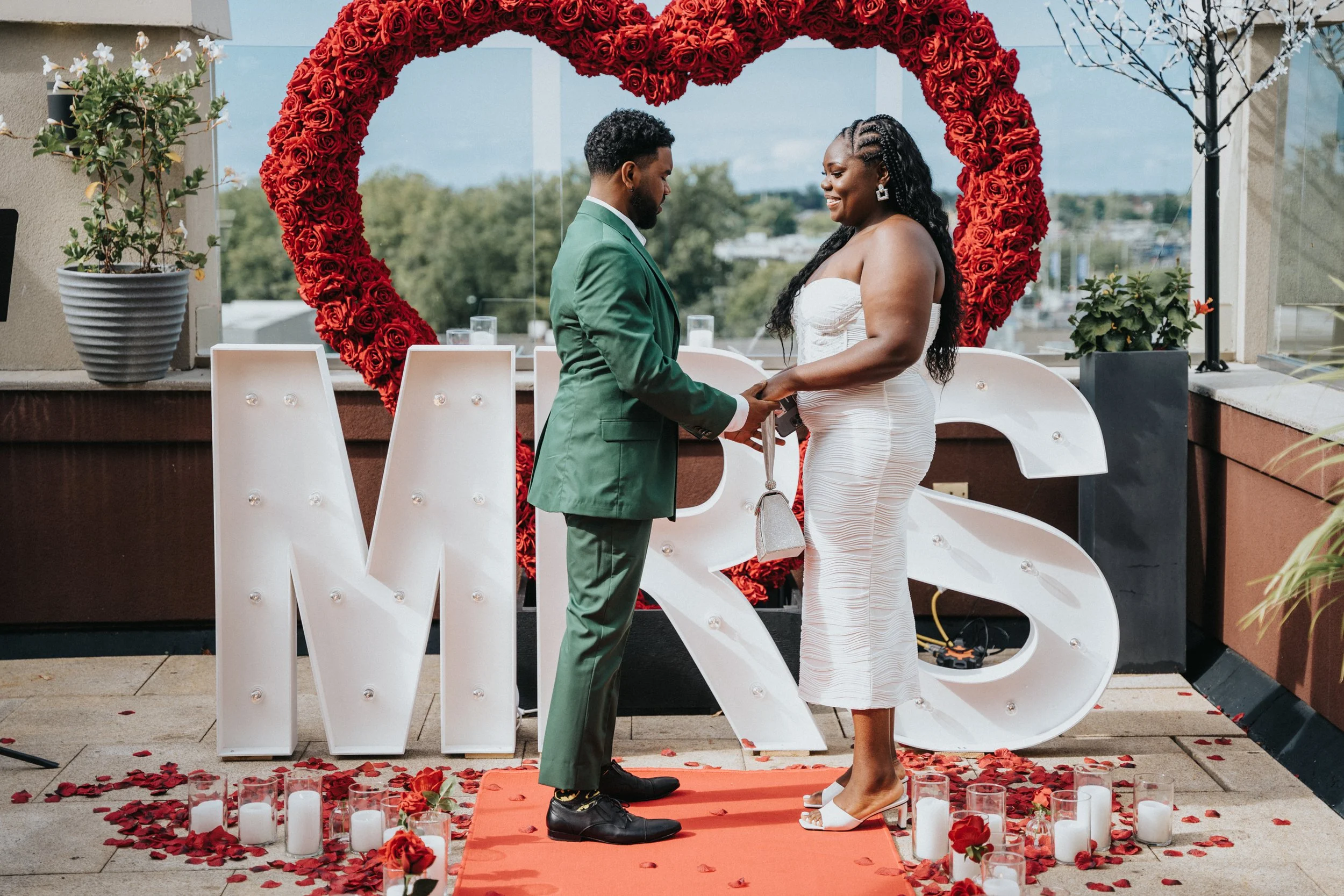 Devonte & Trudy’s wedding proposal was one for the history books. Devonte took time and meticulous thought when booking Niagara Proposals with a custom package. Devonte wanted something unqiue to Trudy and he achieved that! In their beautiful outfits and Devonte decked out in batman socks and Trudy in her stunning heels, they were headed out on a date night to a rooftop bar when they opened the doors to a beautiful large heart arch, rose petal path and the letters spelling MRS… As Devonte was asking her to go from Miss to Mrs with her hand in marriage. Devonte and Trudy was over the moon with the entire surprise moment and jaw-dropping decor as it was literally made from their dreams. They then headed off to dinner after a professional engagement photoshoot and they enjoyed every step of the process because Niagara Proposals took care of everything.